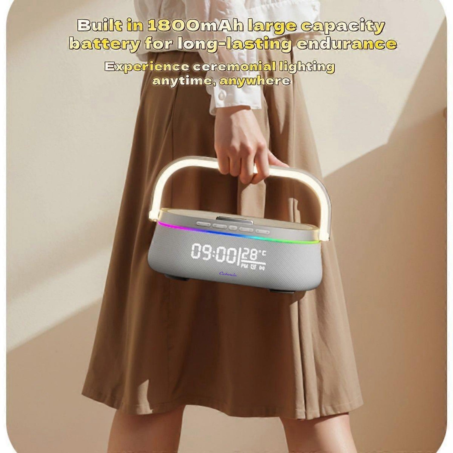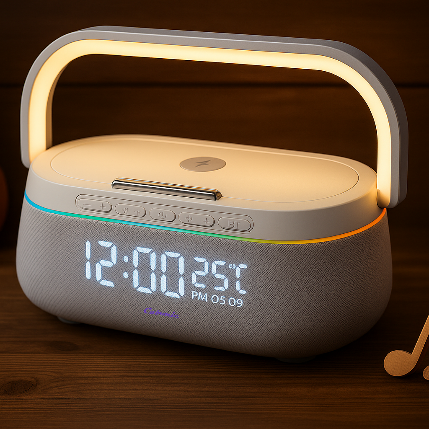 All-in-one solution: Speaker + Wireless Charger + Mood Lamp + Alarm
